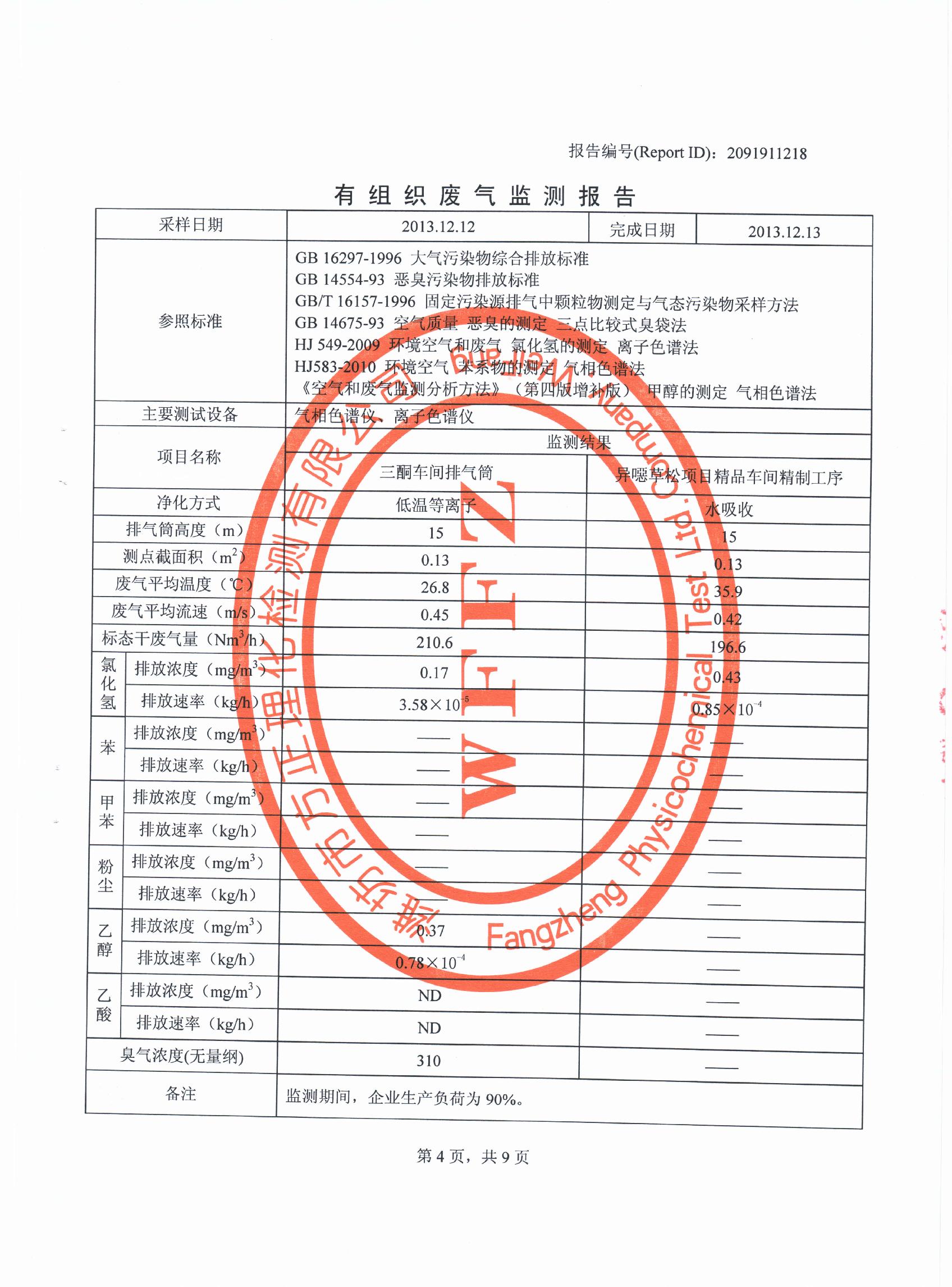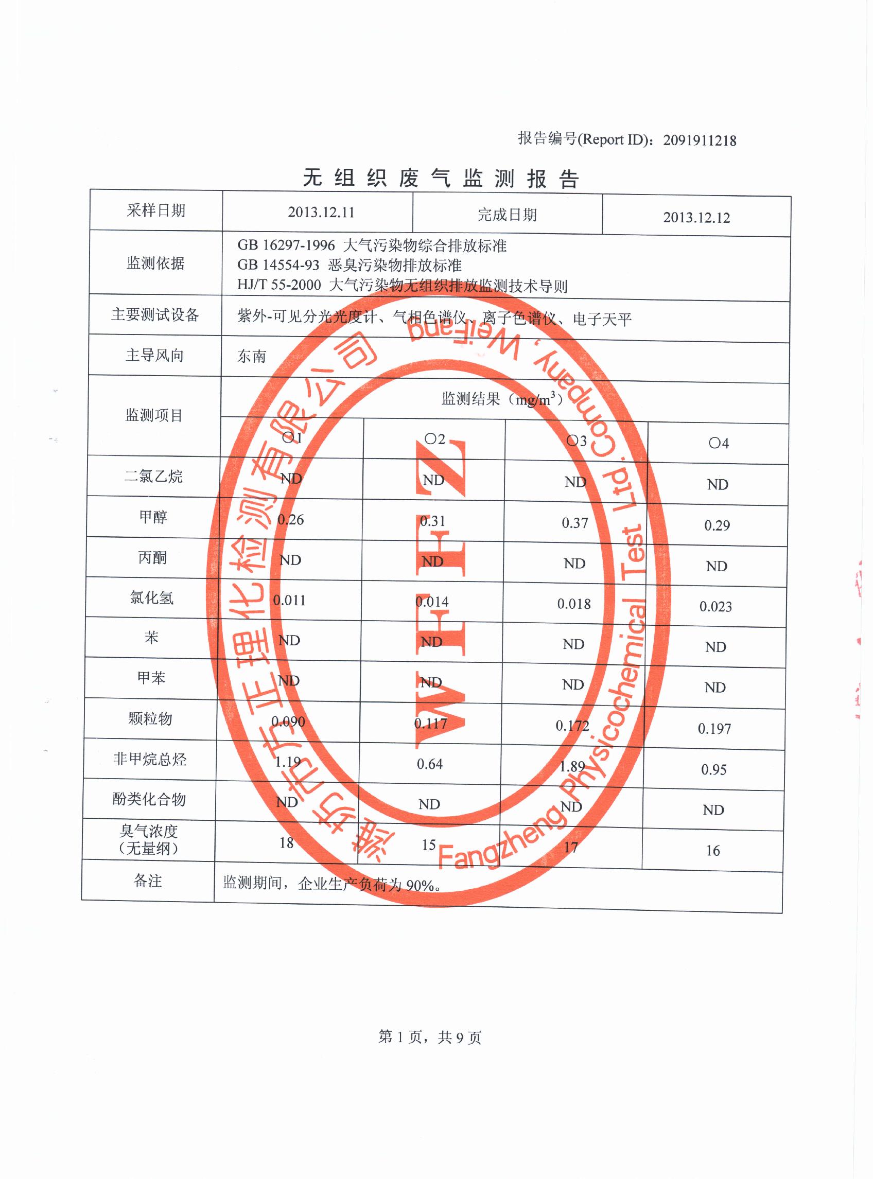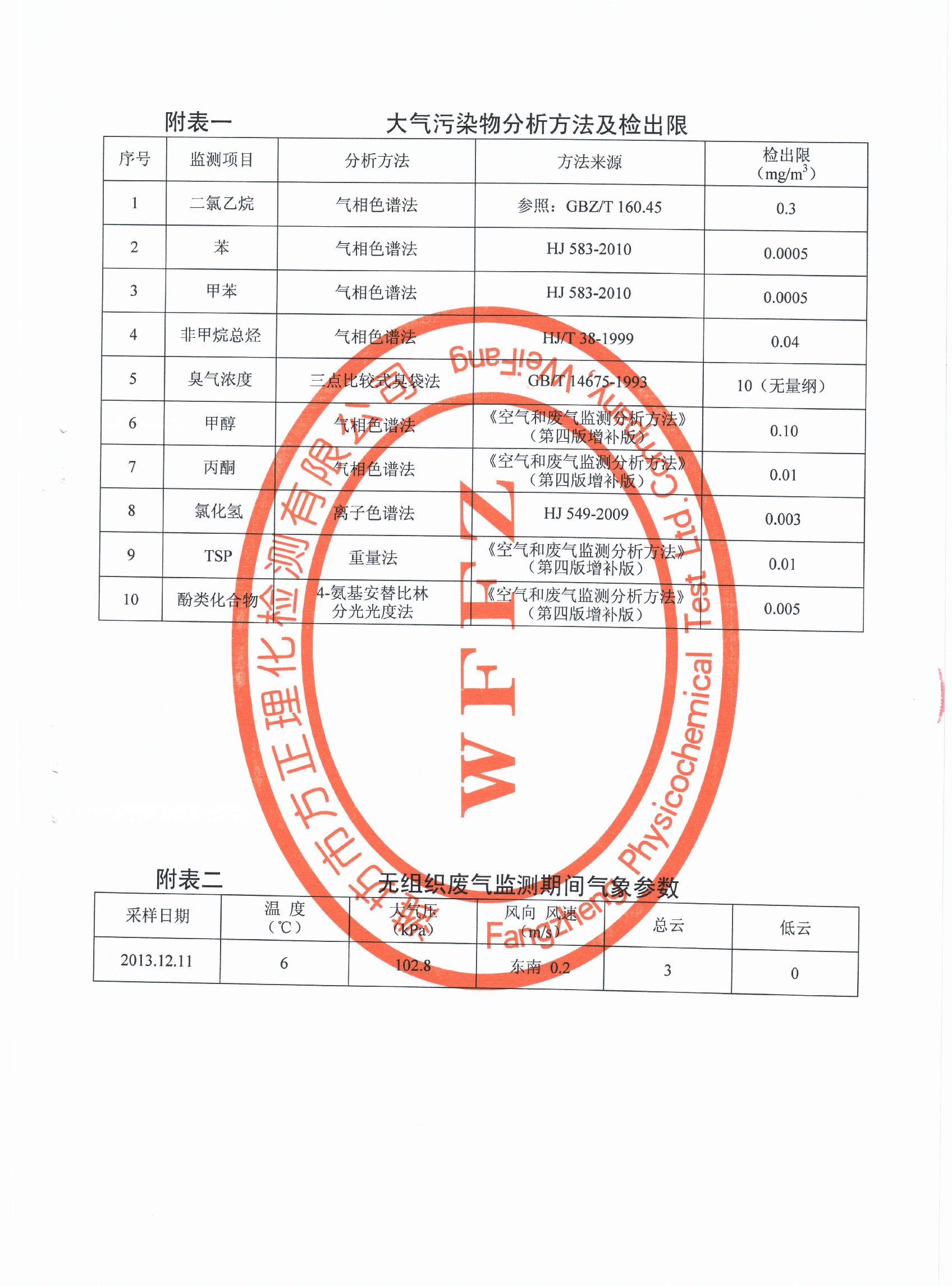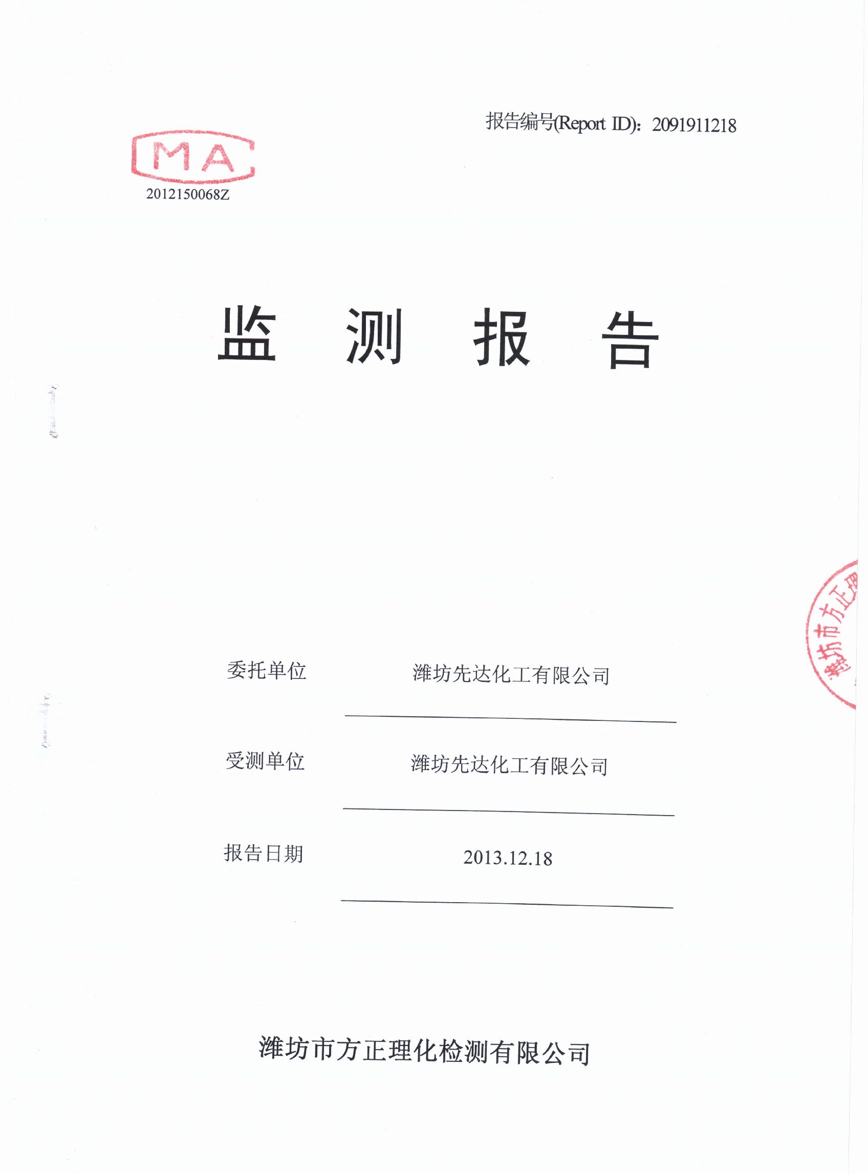潍坊先达化工有限公司气体监测报告2013年第四季度