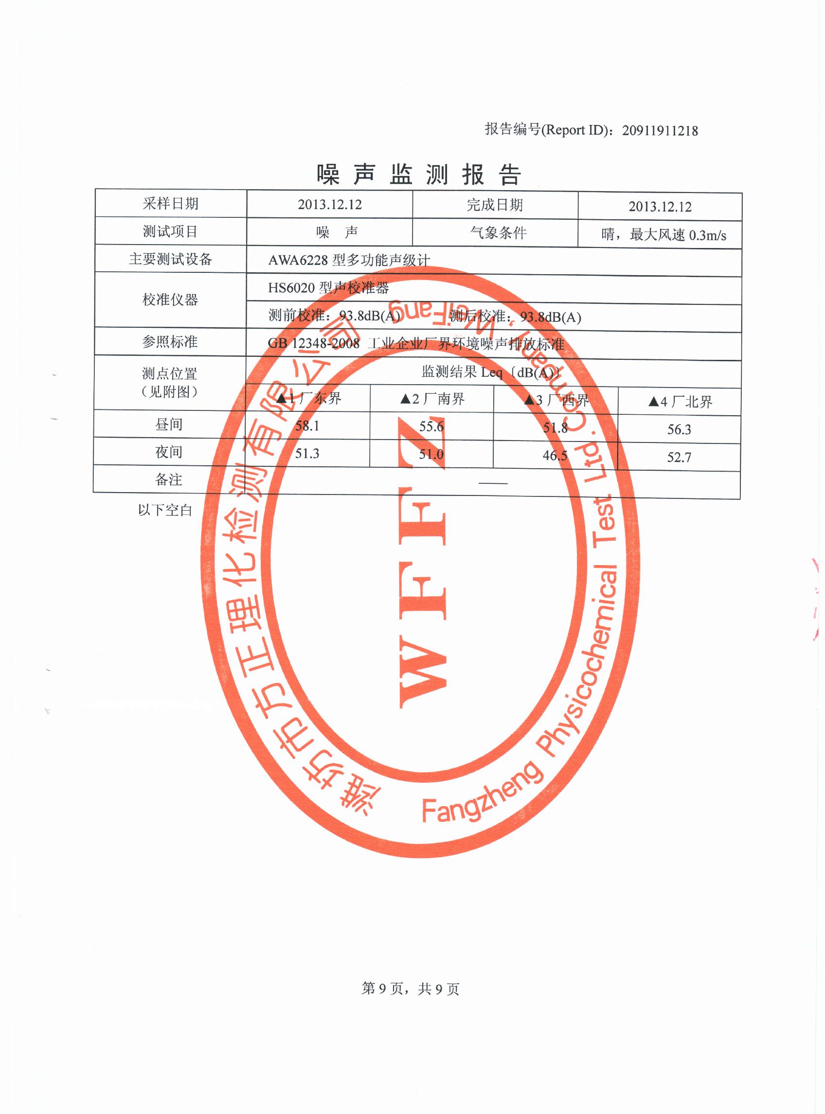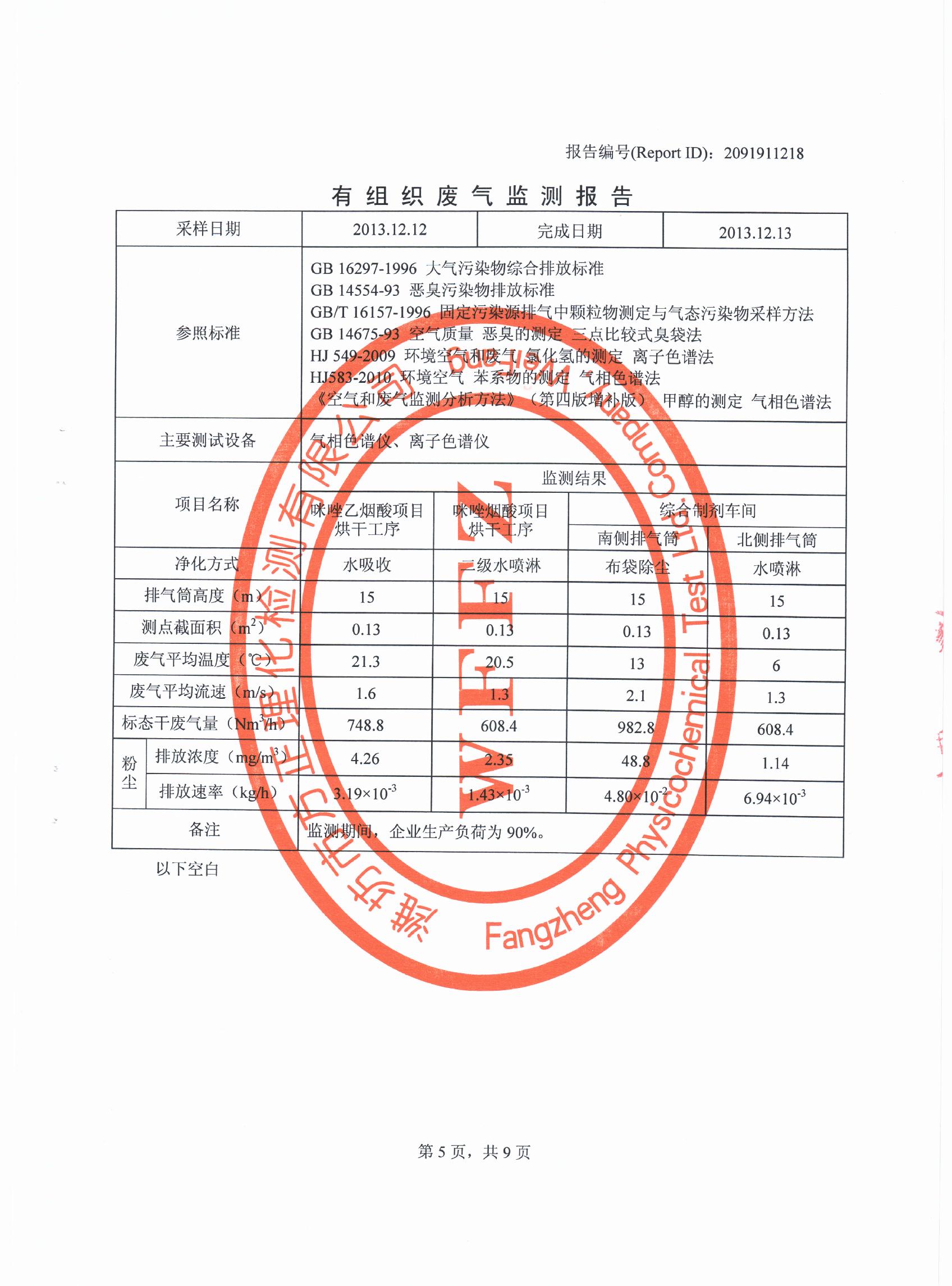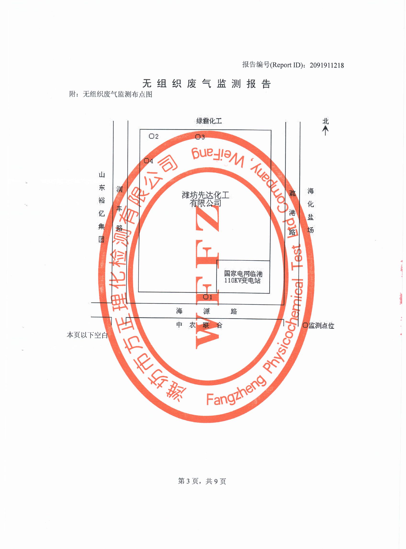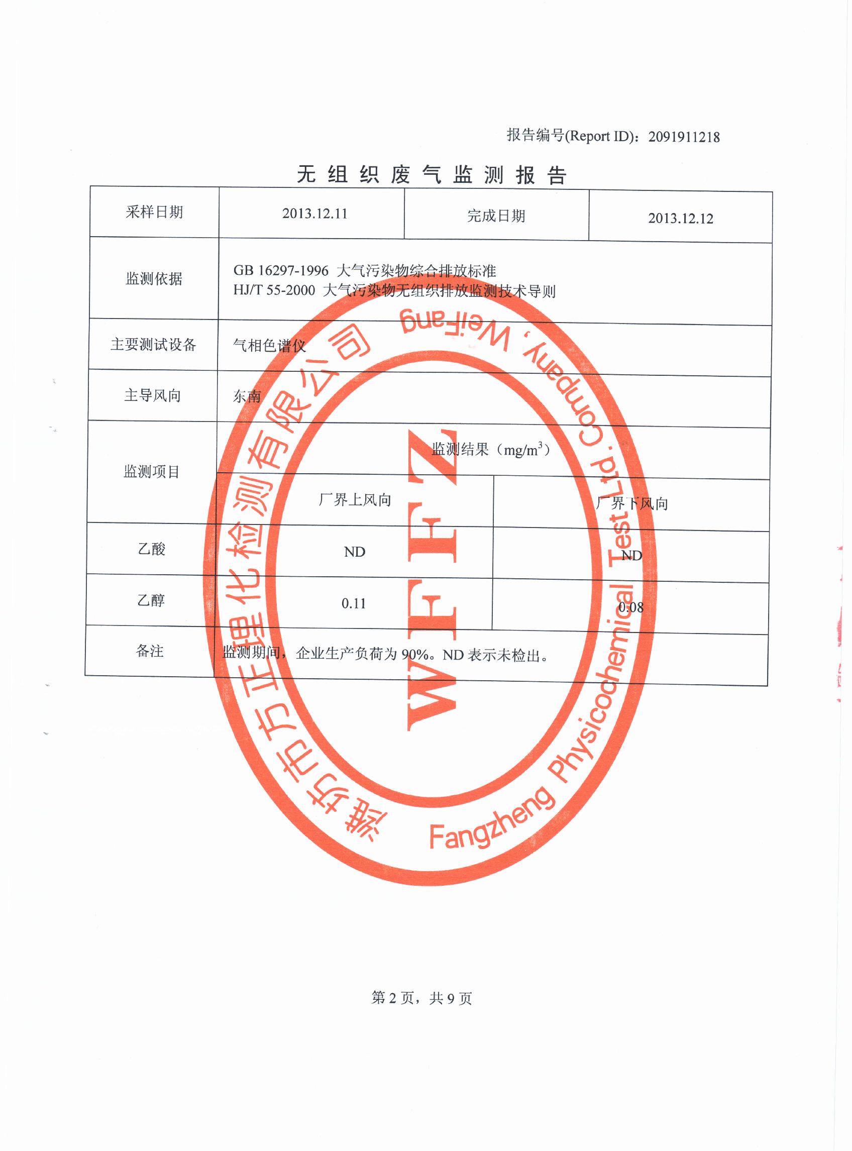 潍坊先达化工有限公司气体监测报告2013年第四季度