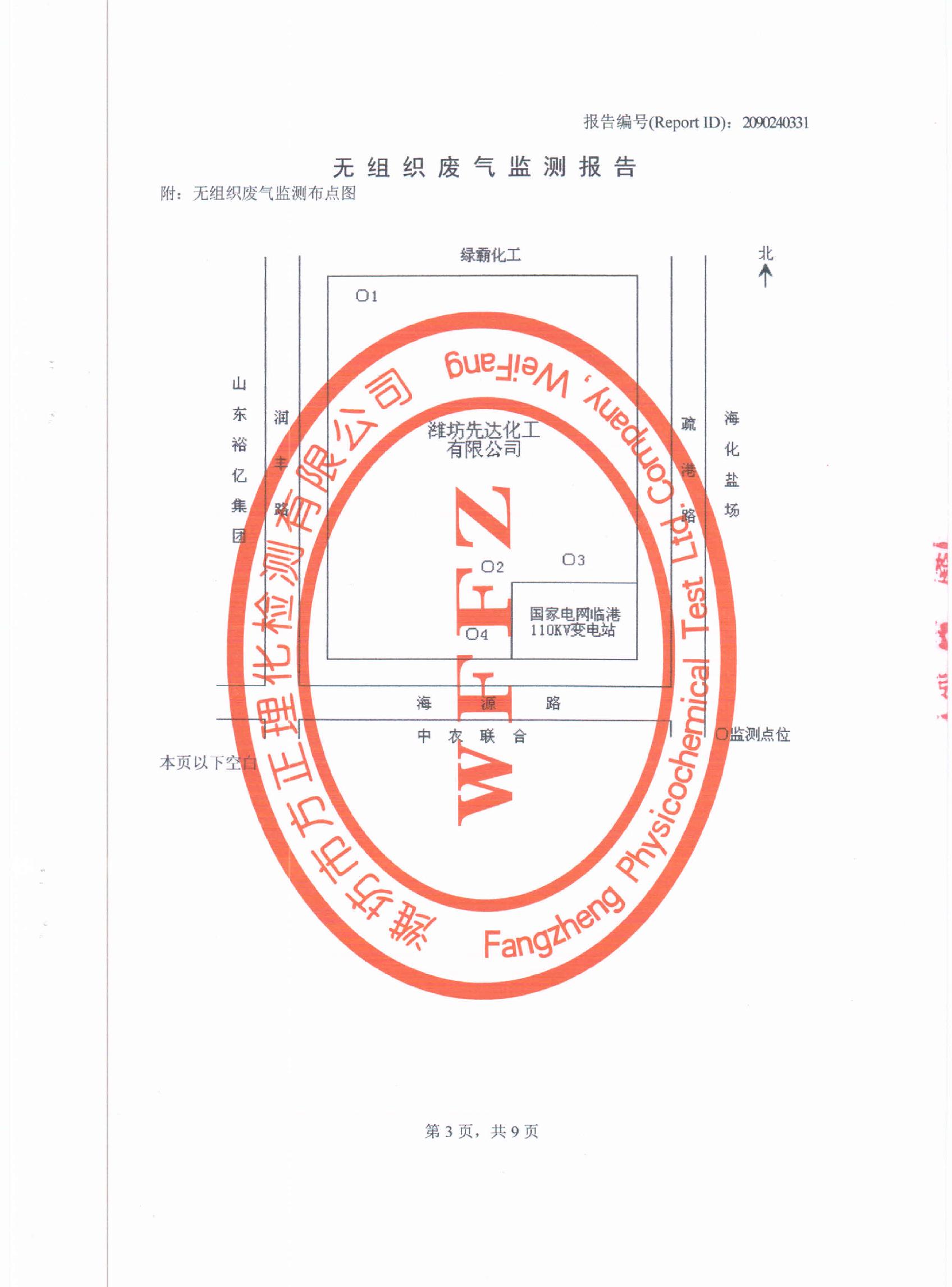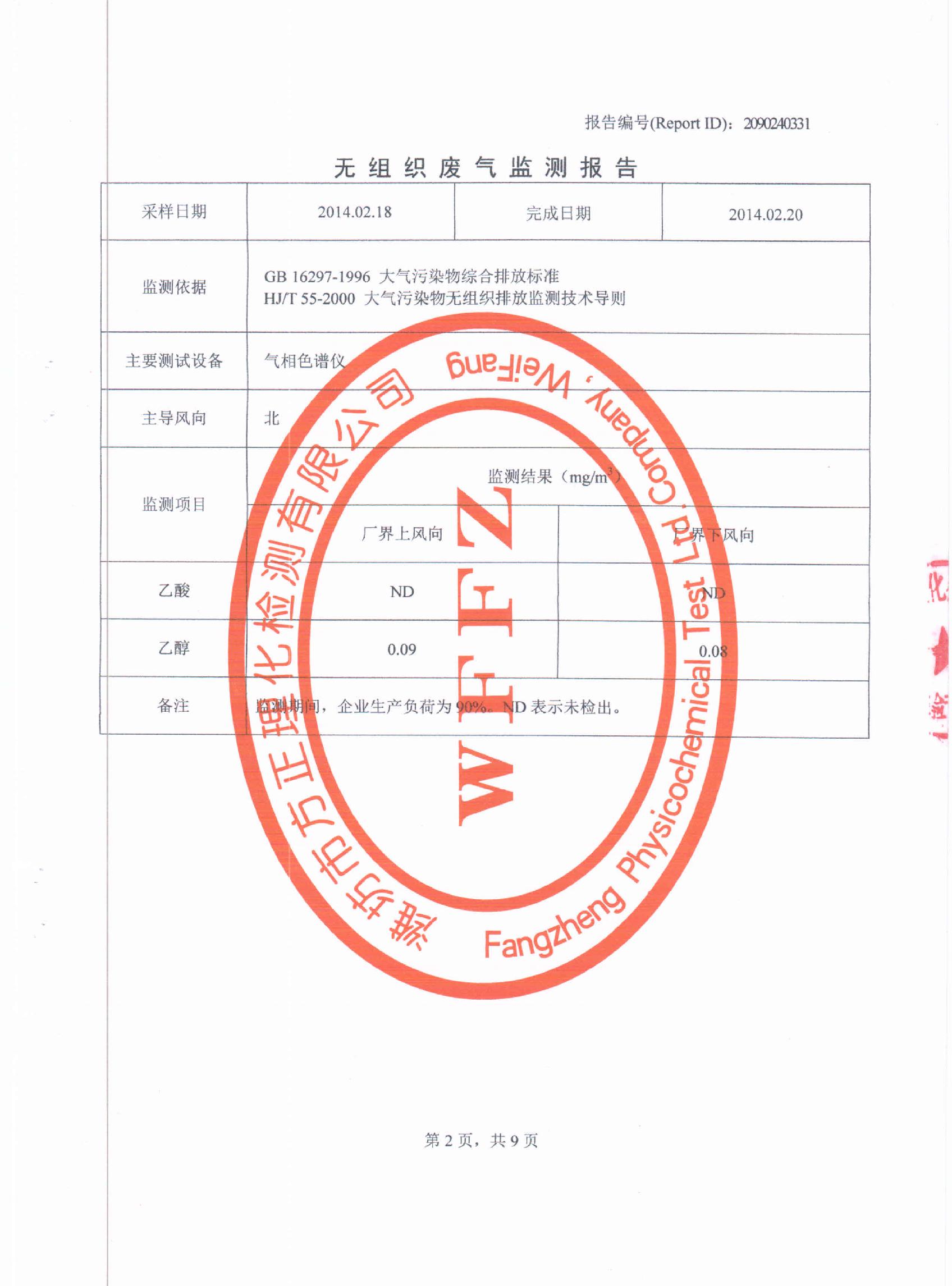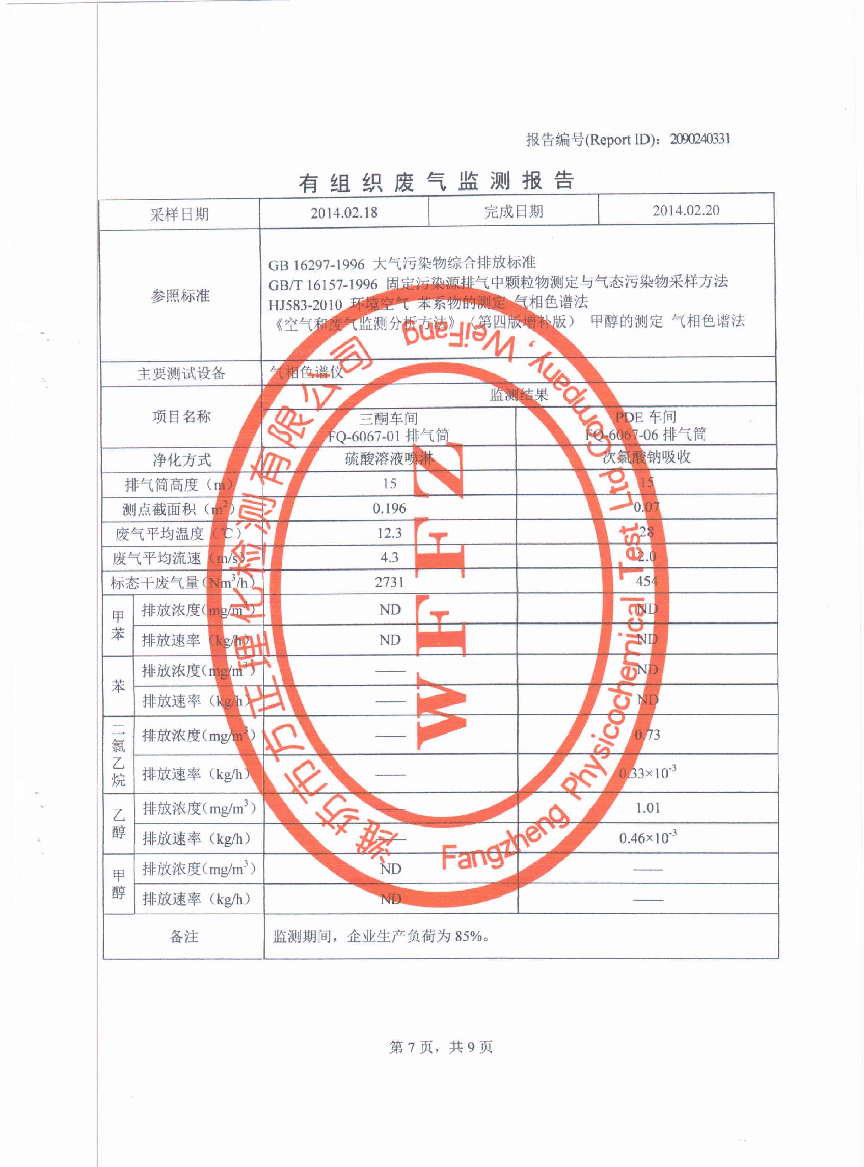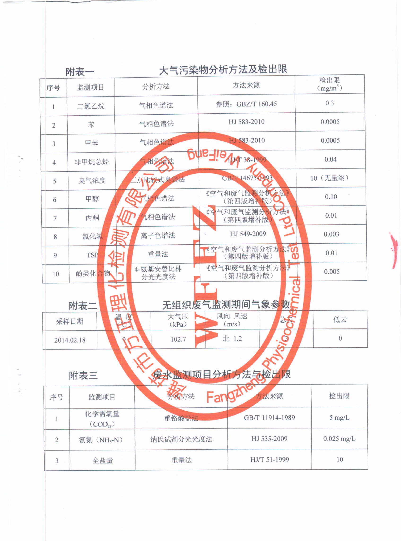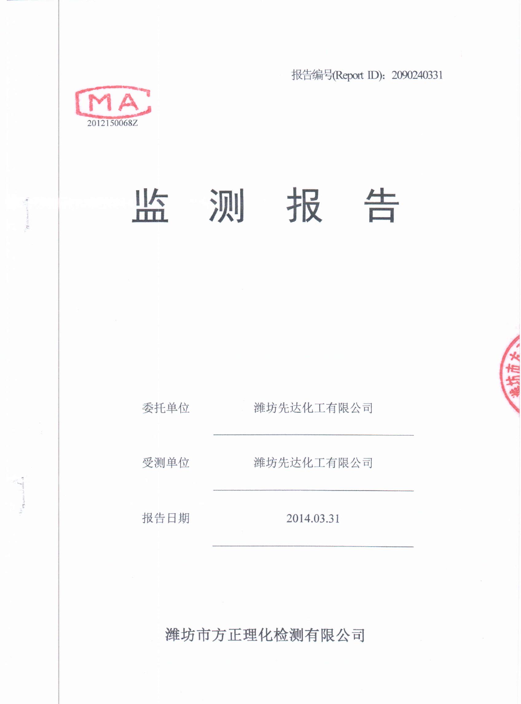 潍坊先达化工有限公司2014年第一季度环境监测报告