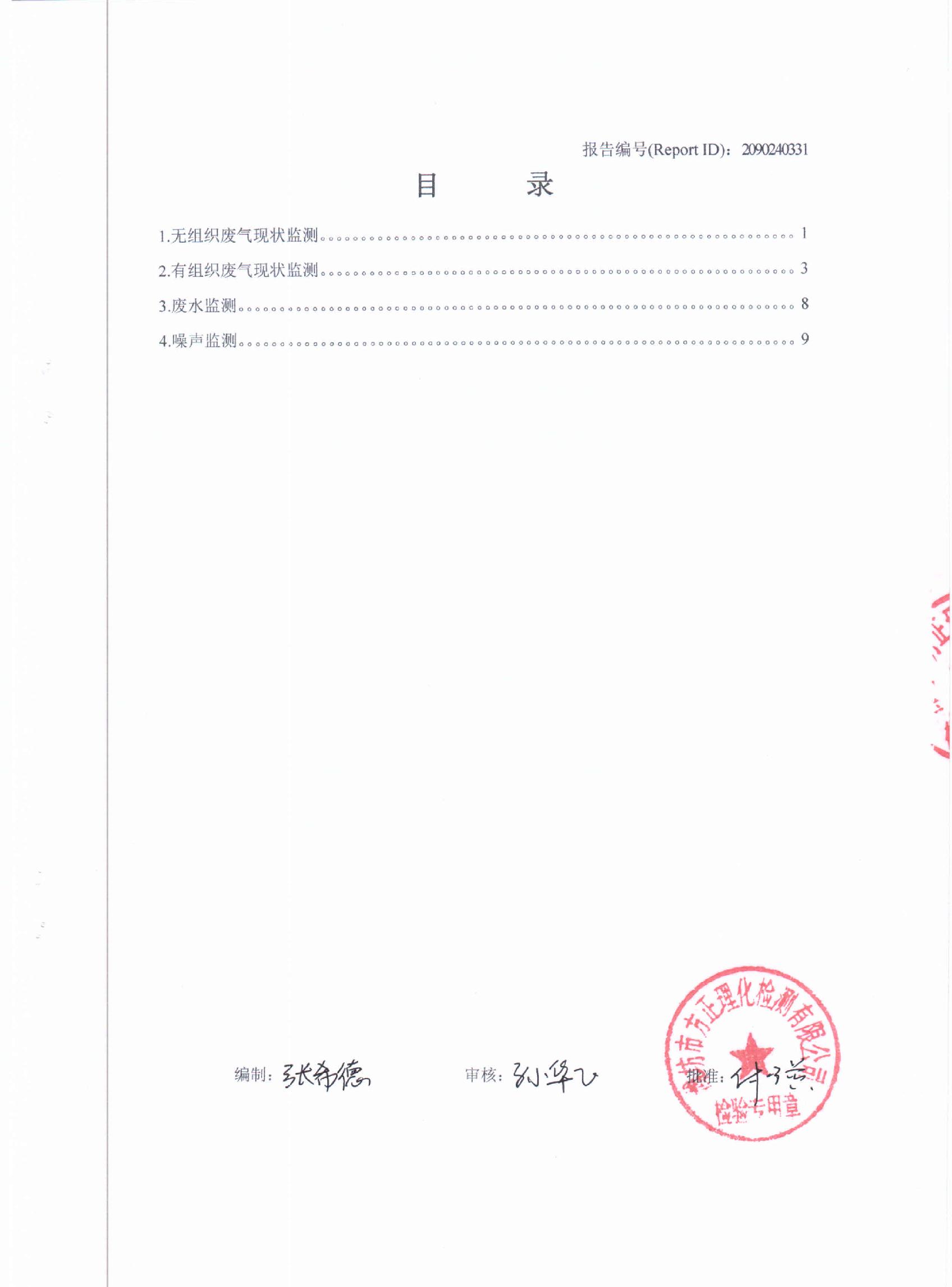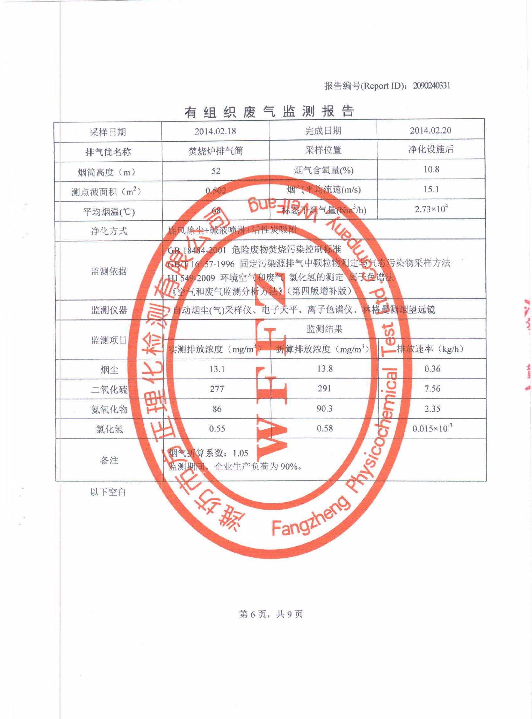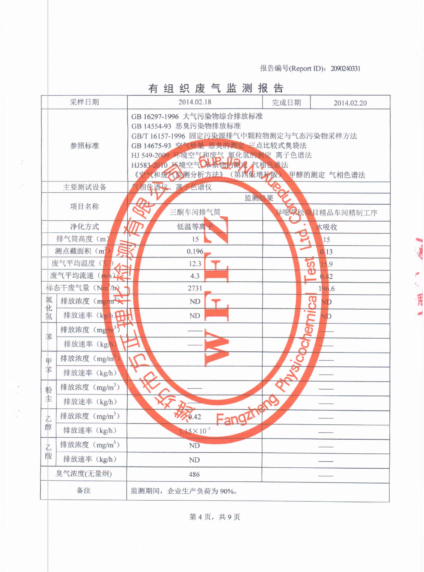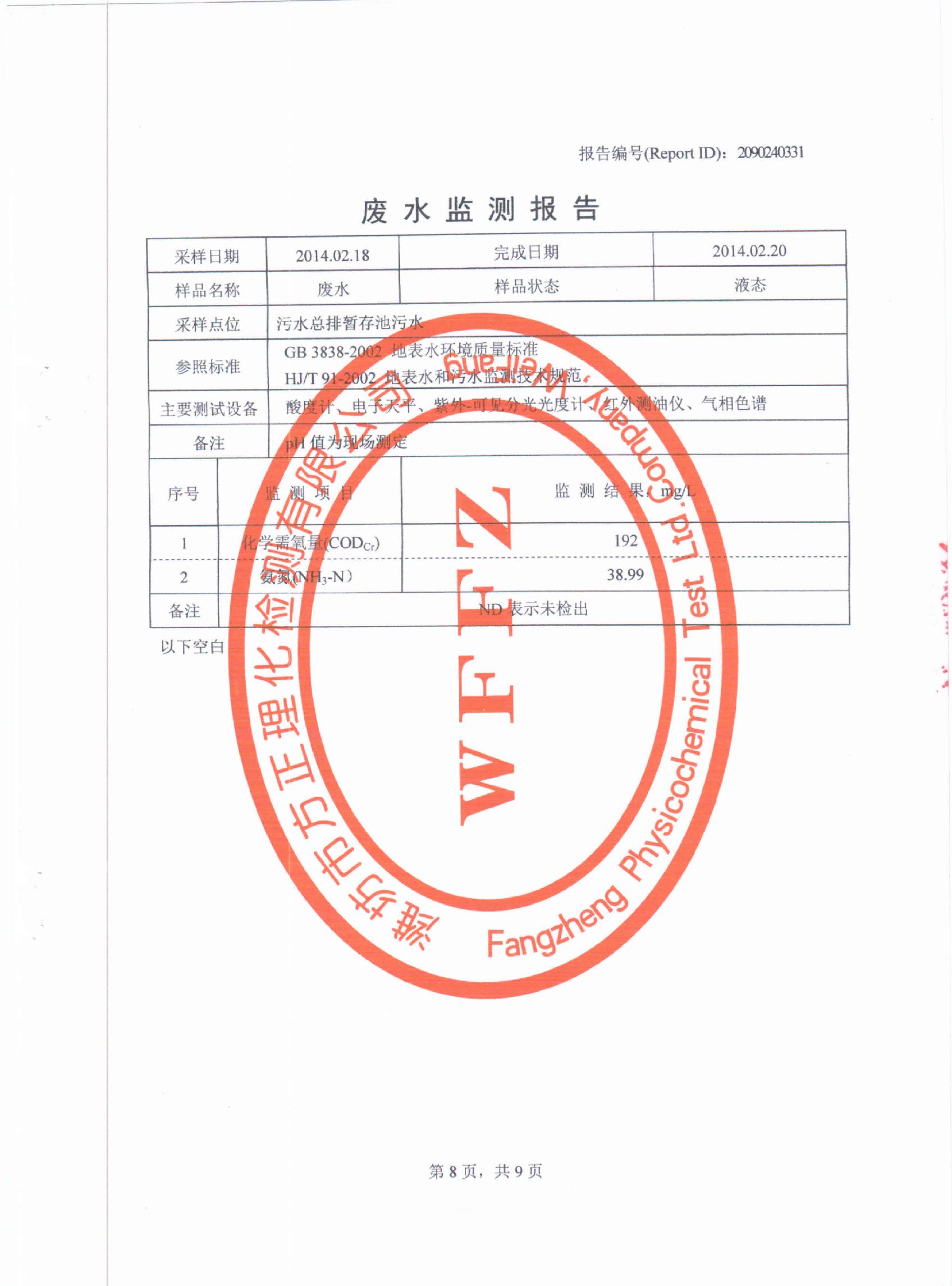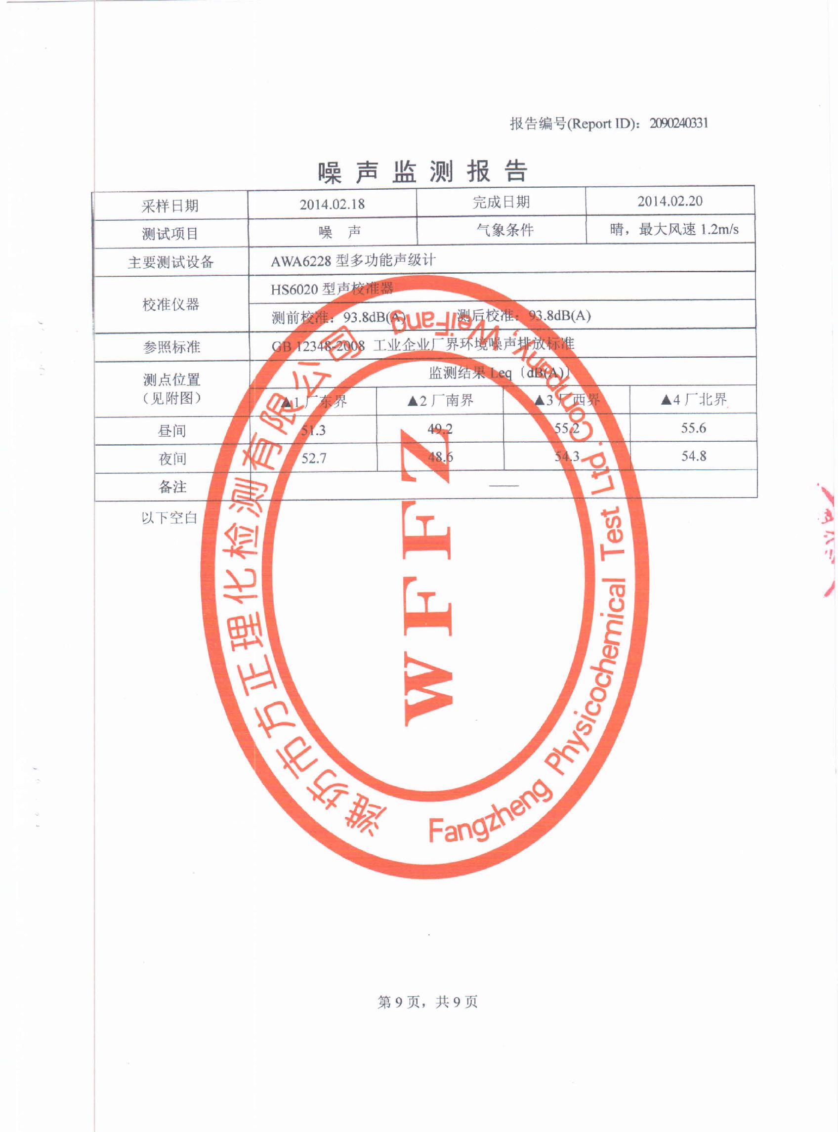 潍坊先达化工有限公司2014年第一季度环境监测报告